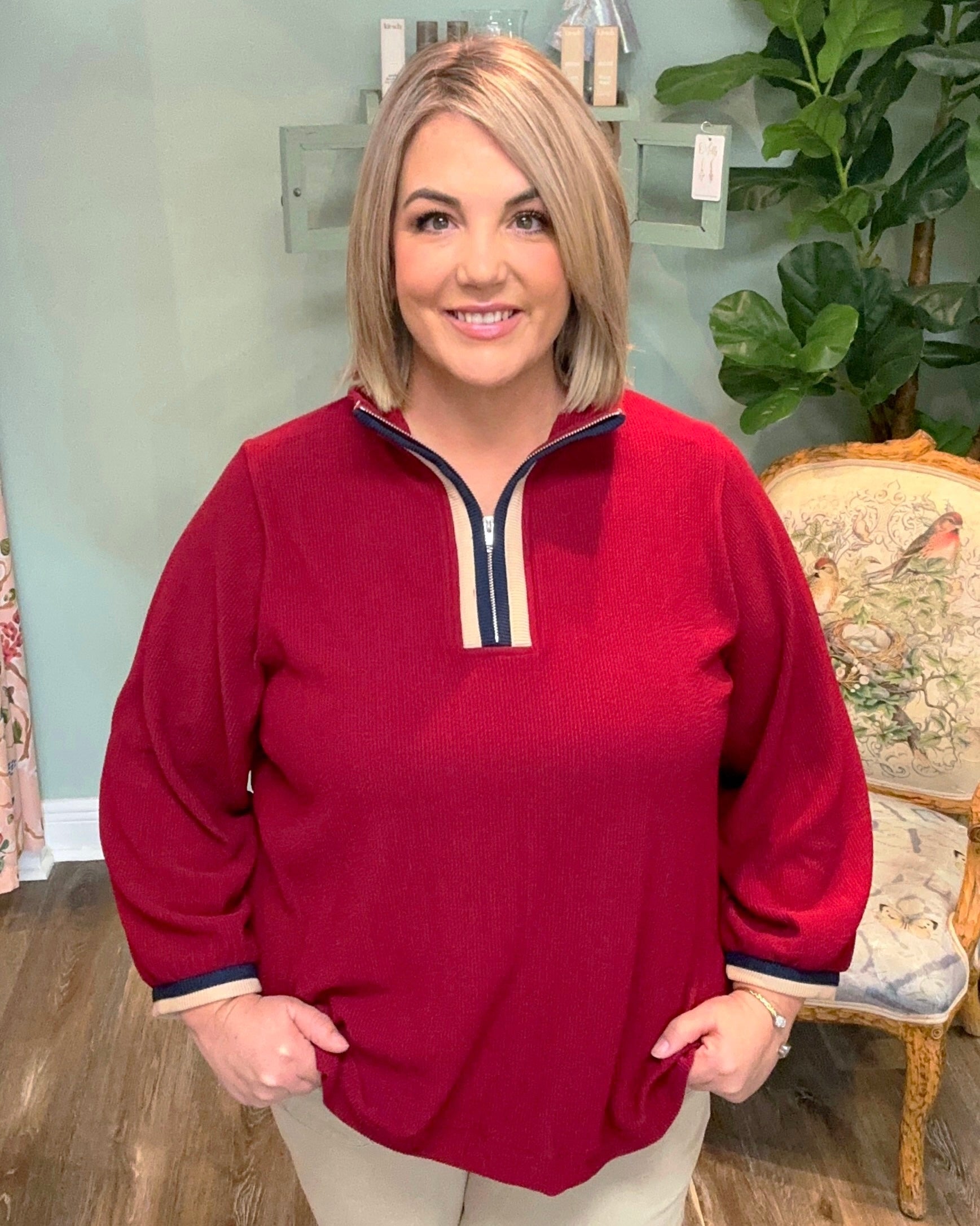 Indulge in sophistication and elevate your wardrobe with our Dark Burgundy Half Zip Top. Crafted in a luxurious hue, this top exudes an air of exclusivity. Complete with a half zip and made with only the finest materials, it offers both style and comfort. Elevate your look with this elegant must-have.