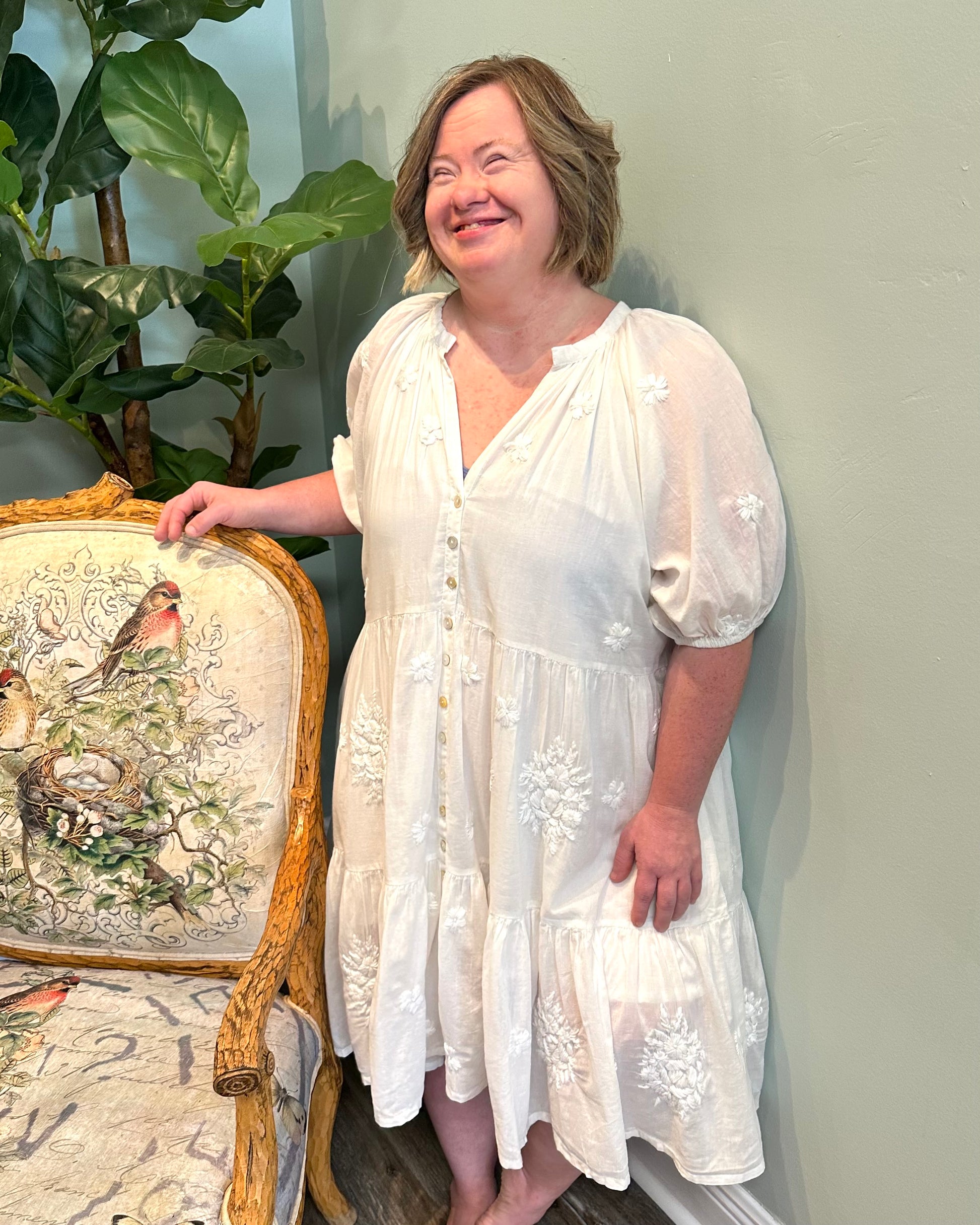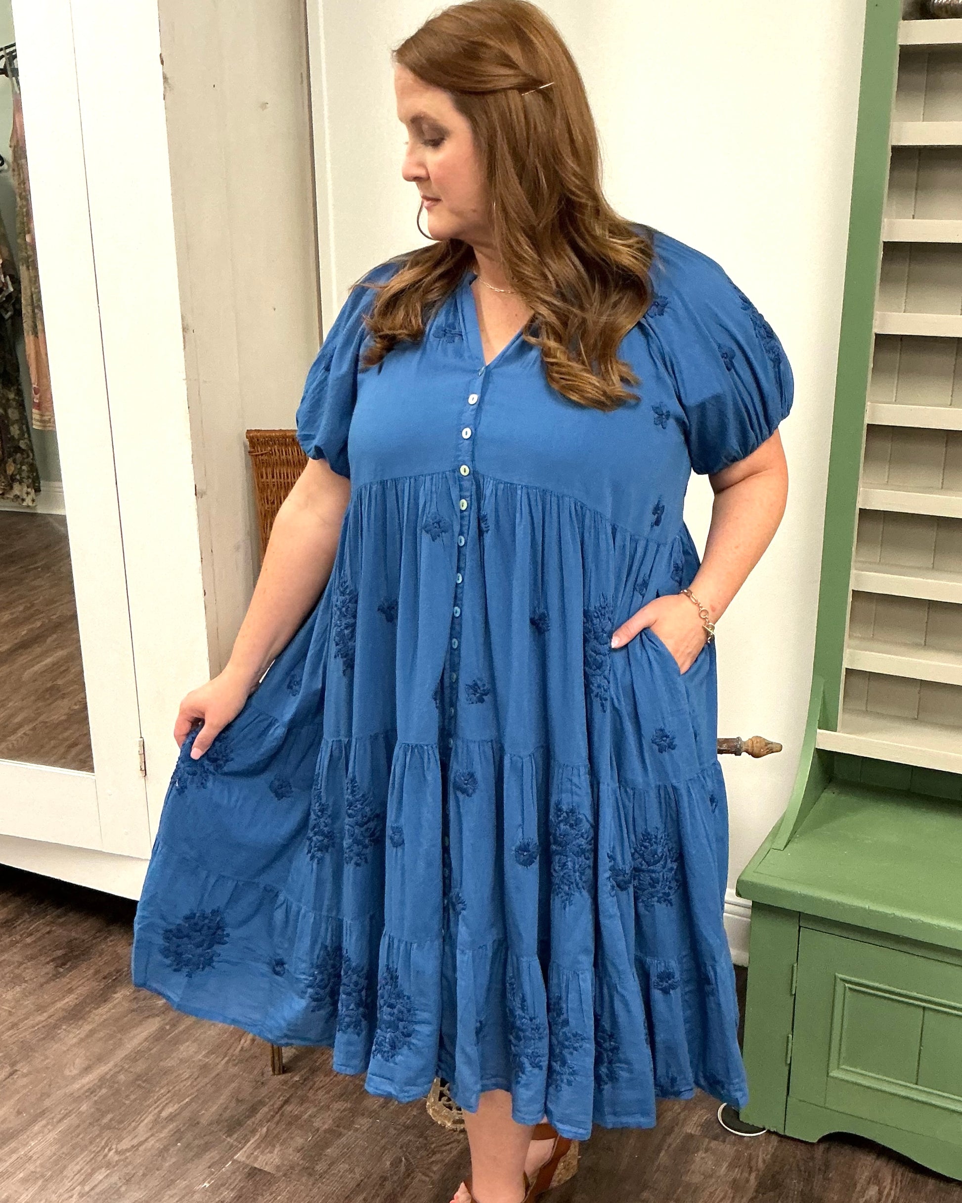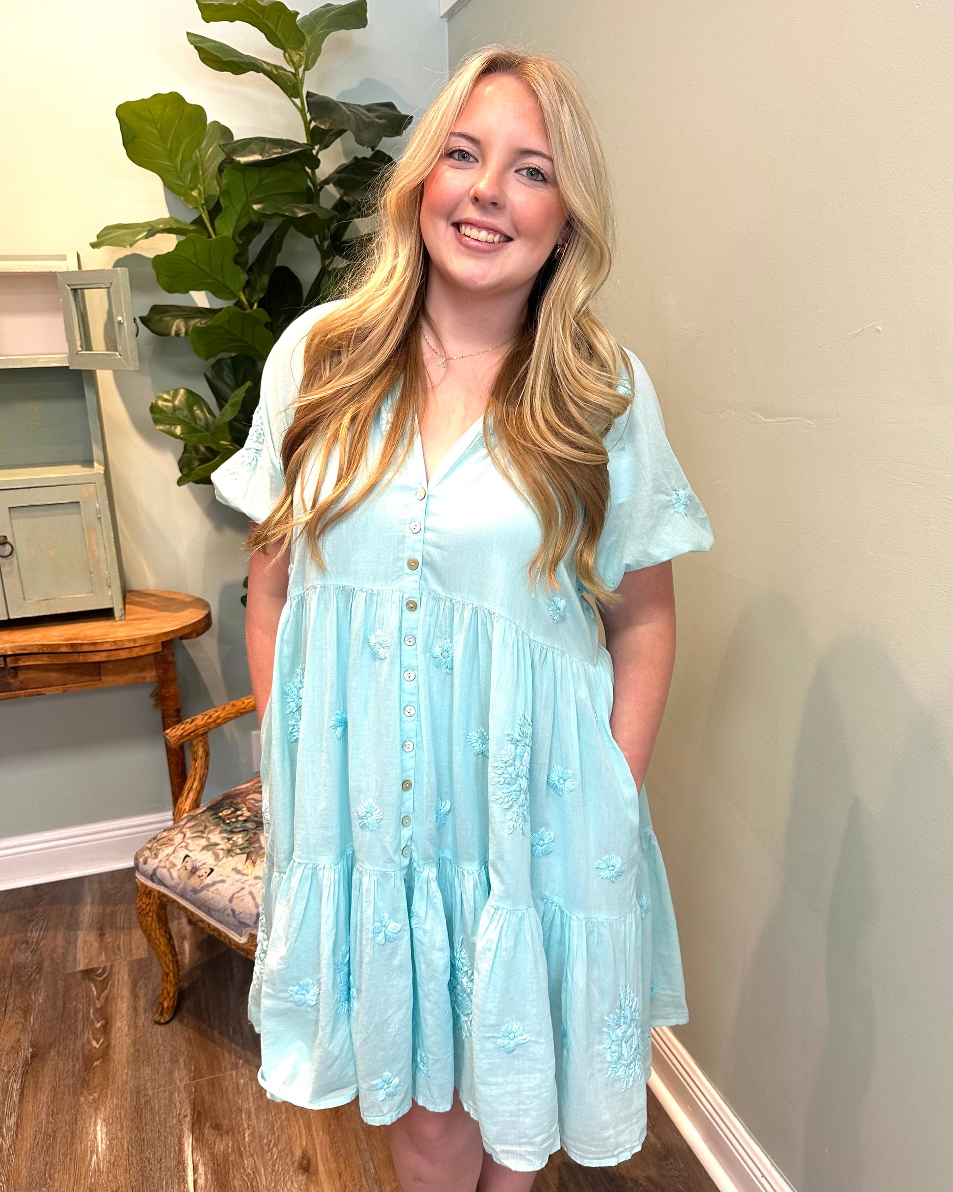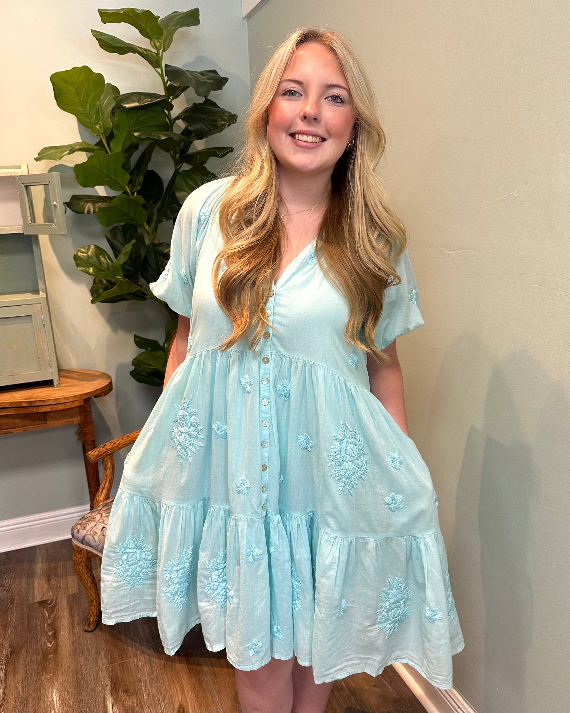 Effortlessly feminine and breezy, this tiered cotton dress features delicate embroidered floral details that add a soft, handcrafted touch. The button-up front brings classic charm, while the lightweight cotton fabric and tiered silhouette offer airy movement and all-day comfort. Perfect for warm days, garden parties, or weekend strolls.