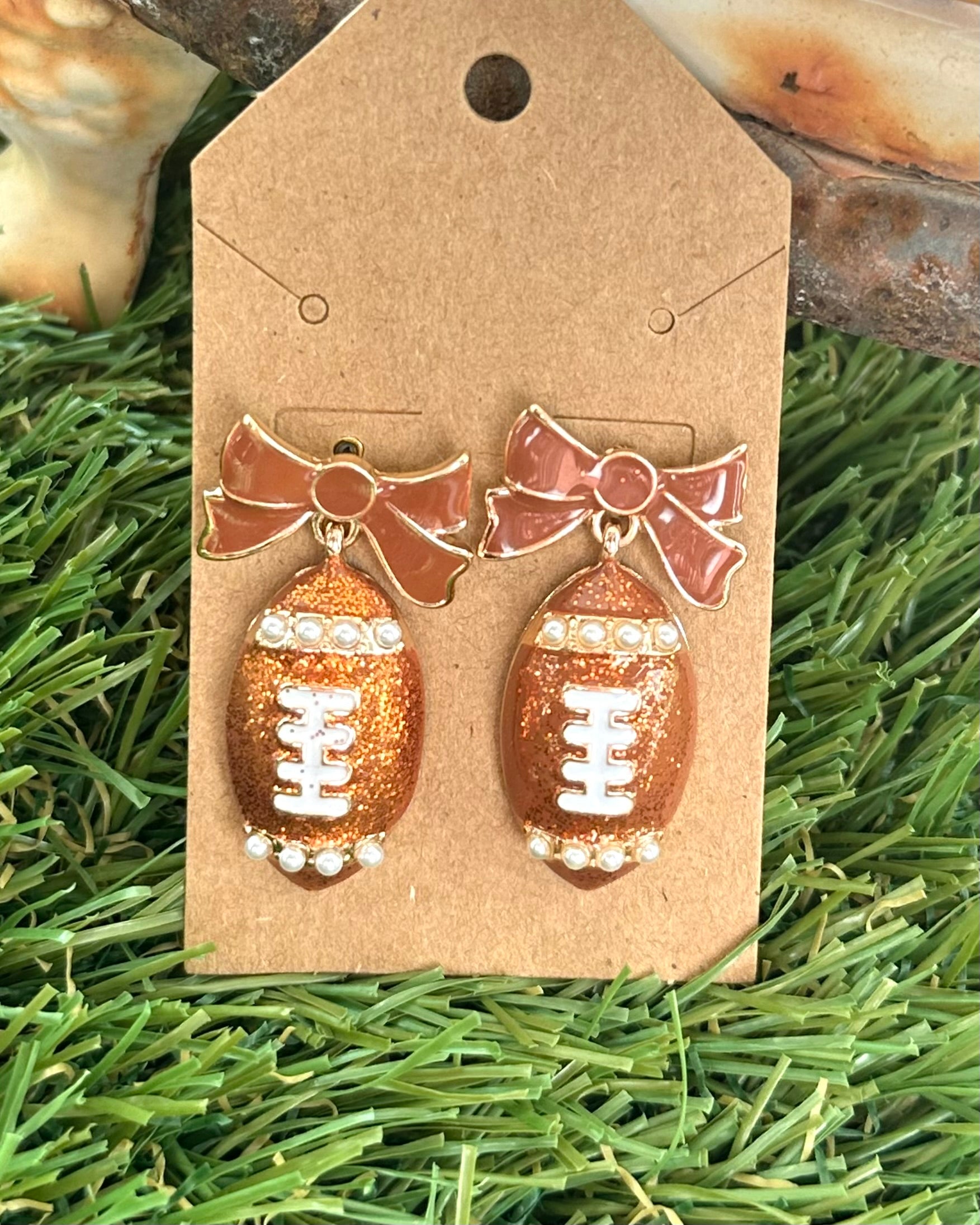 Add a touch of fun to your outfit with these playful Football and Bow Earrings featuring delicate pearls. Perfect for showing off your sporty spirit while keeping things charming and chic, these earrings bring sporty flair and sweet elegance together for a look that scores every time.