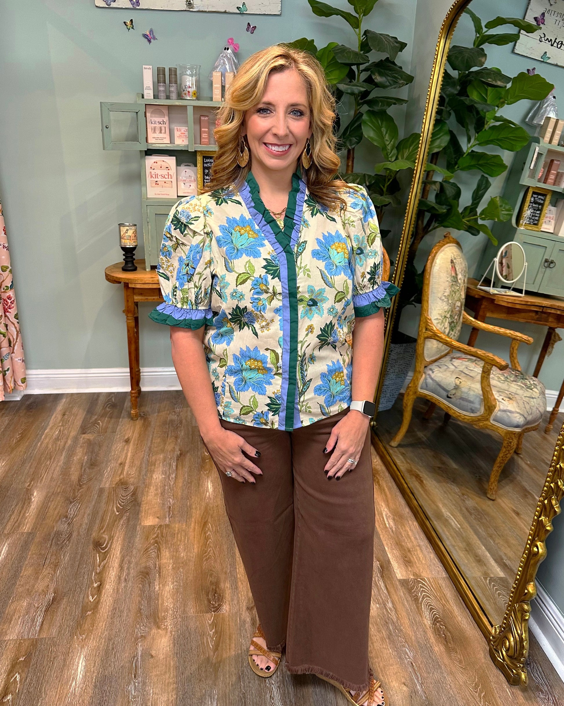 Indulge in effortless style with our Green and Blue Floral Detail Ruffle Collar Top. The delicate floral detailing and ruffle collar add a touch of femininity to this versatile top, perfect for any occasion. Elevate your wardrobe with this must-have top that exudes charm and elegance.