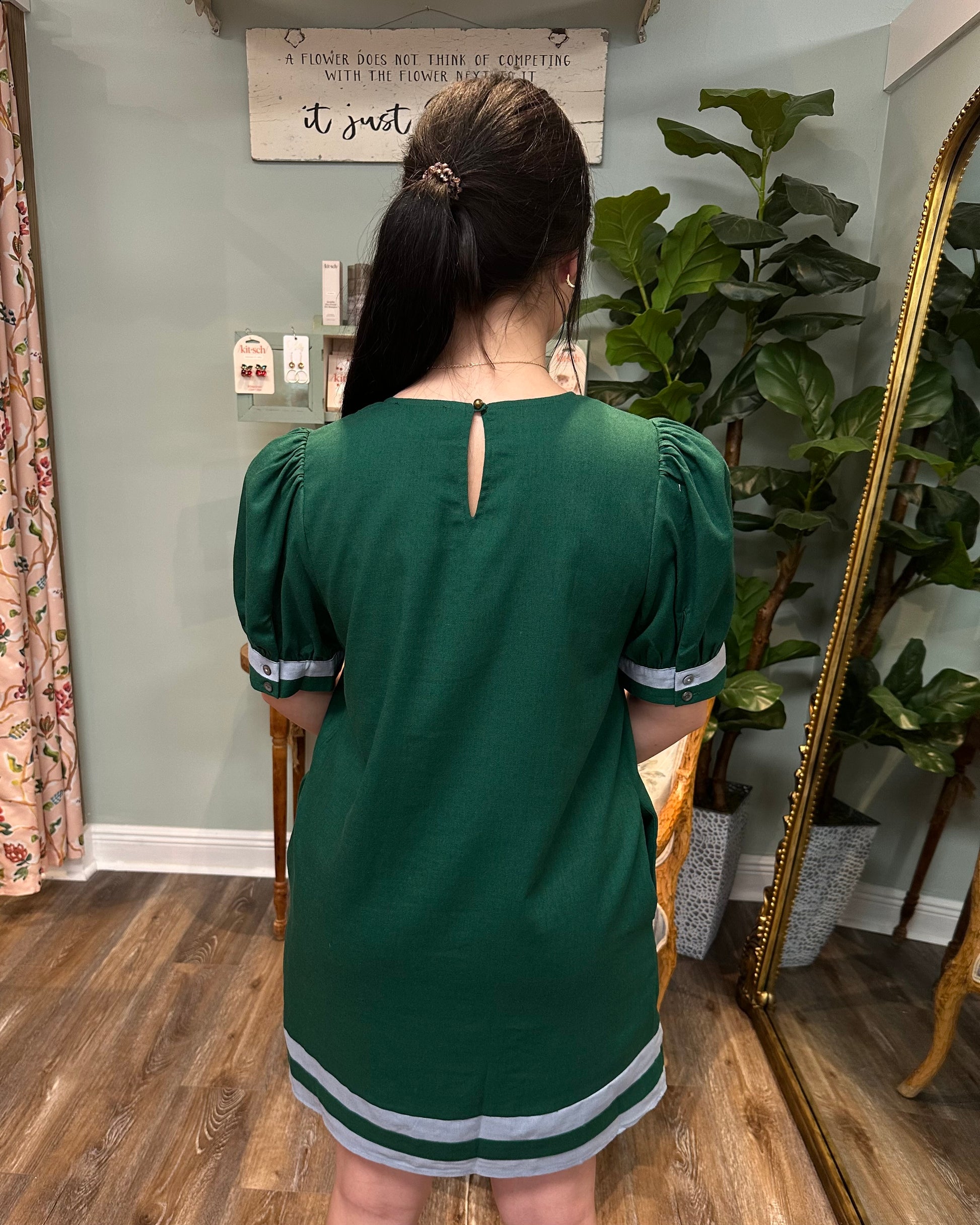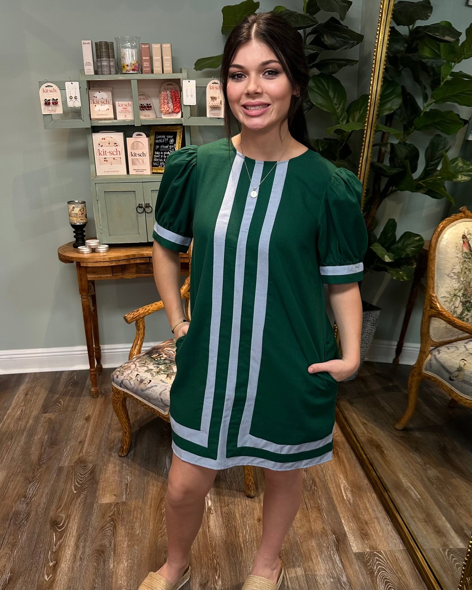 Experience the perfect blend of elegance and charm with our Hunter Green Shift Dress with Blue Edge. The rich hunter green color is complemented by a stunning pop of blue, creating a bold and unforgettable look. Perfect for any occasion, this dress will make you feel confident and stylish. Embrace your individuality and stand out in this unique and beautiful piece.