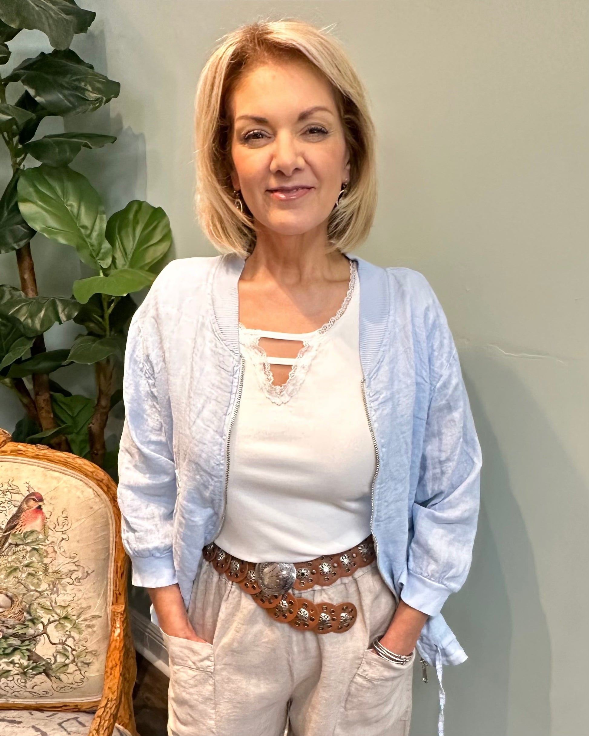 Made from lightweight linen, it features ribbed trim, a zip front, and a relaxed fit — perfect for layering through warmer seasons with effortless style.