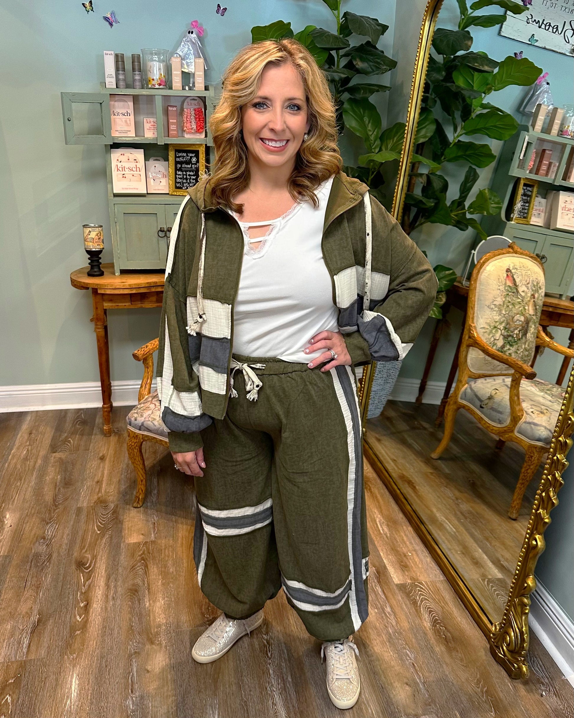 Upgrade your loungewear game with our Olive Patchwork Joggers! These stylish joggers provide ultimate comfort and versatility, perfect for all-day wear. Made with high-quality fabric, they offer a relaxed fit and are perfect for any activity. Elevate your wardrobe with these must-have joggers!