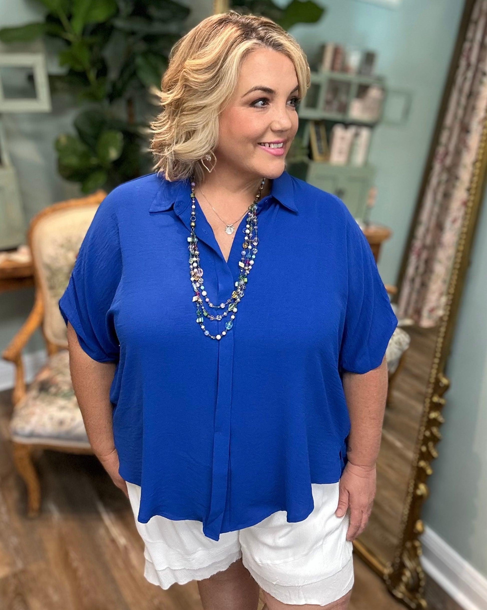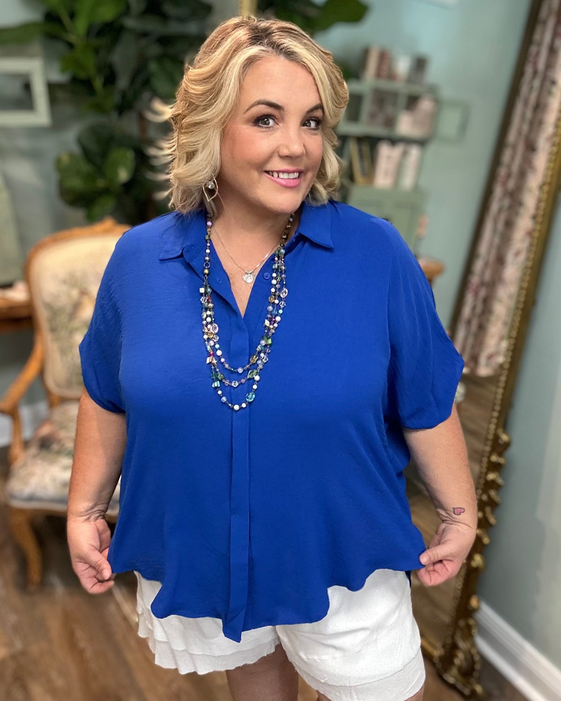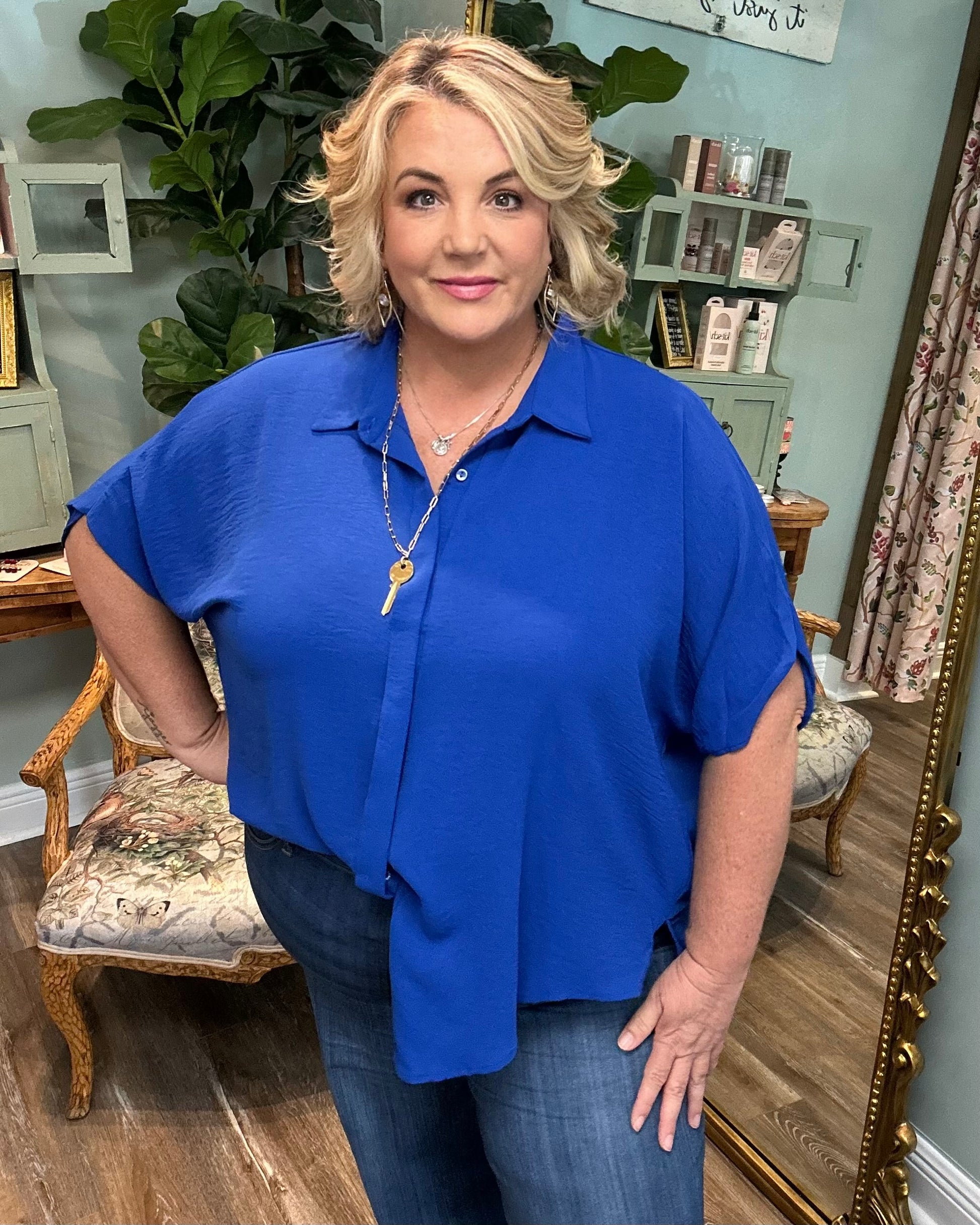 Bold and effortless, this royal blue button-up features an oversized fit and a high-low hem for a modern twist on a classic look.