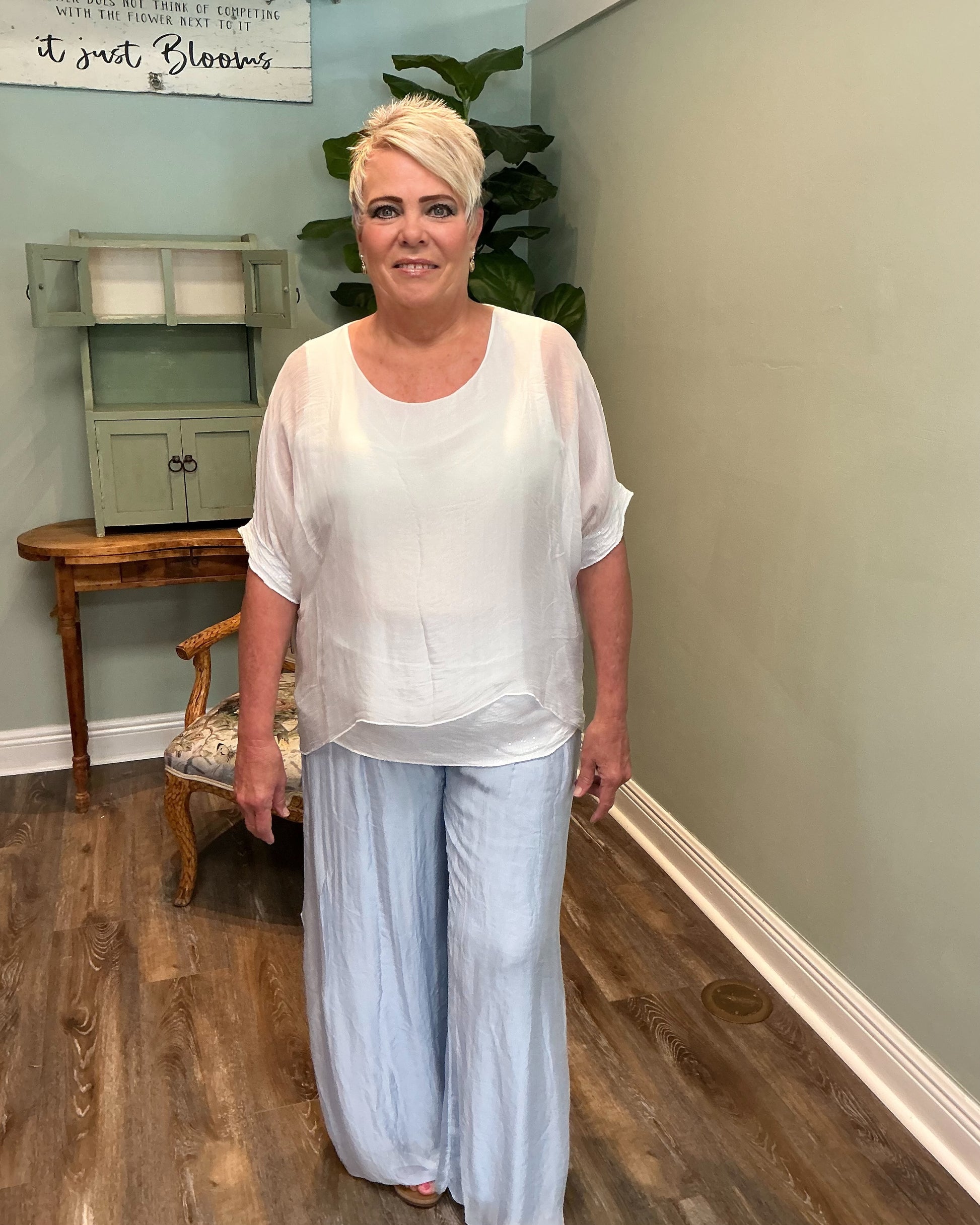 Add a touch of glamour to your wardrobe with this flowy silk top, featuring delicate sequin detailing along the sleeves and hemline. Lightweight and elegant, the soft silk drapes beautifully, offering both comfort and sophistication—perfect for dressing up your favorite jeans or pairing with a sleek skirt for evening outings.