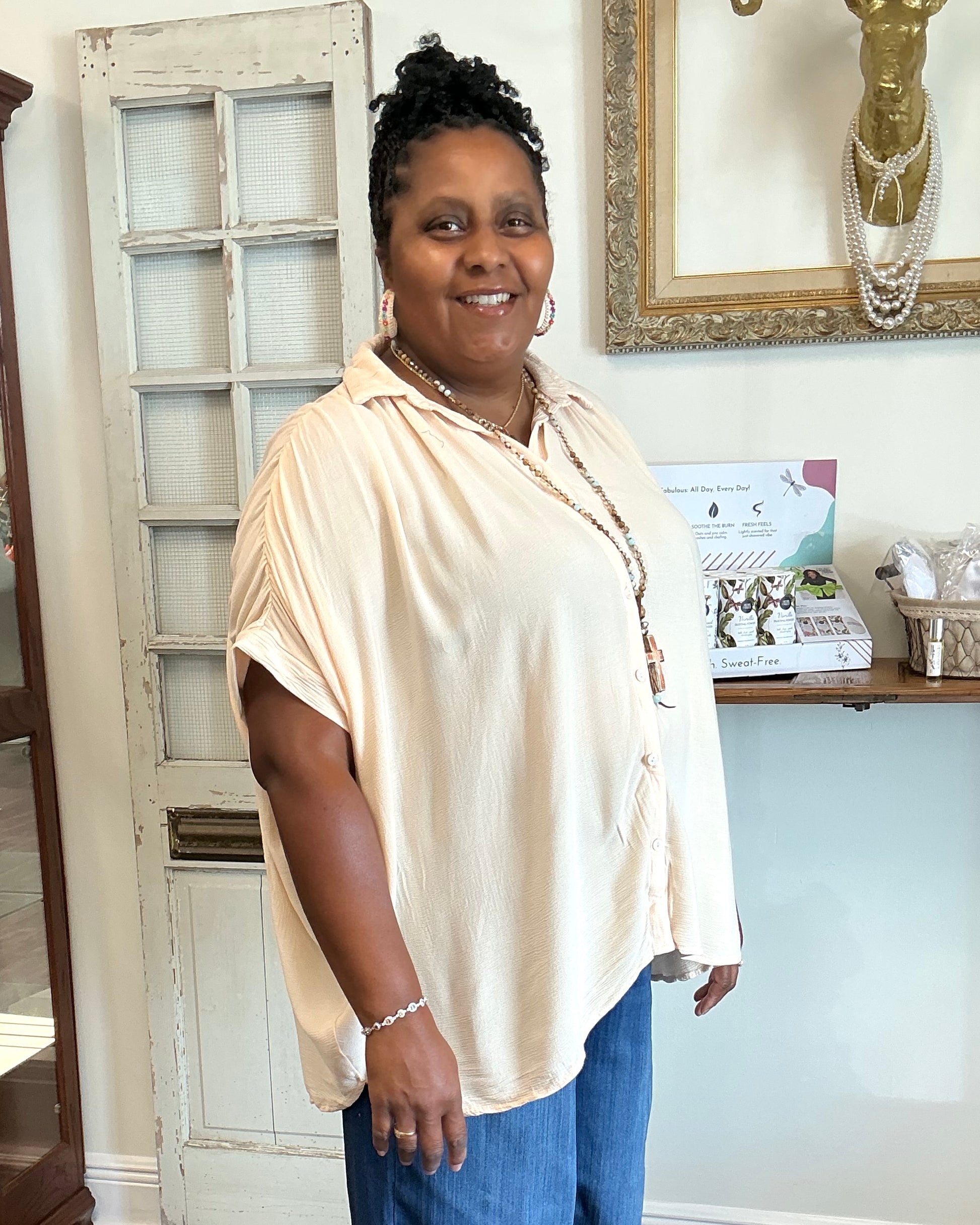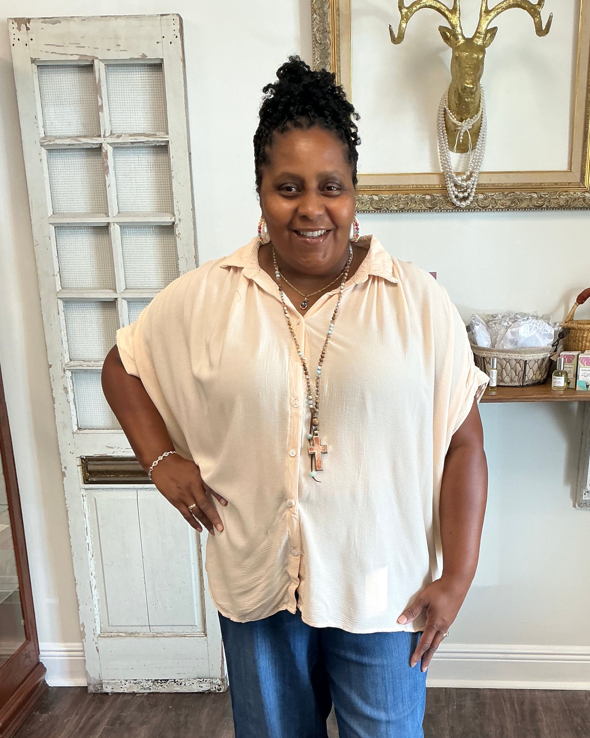 Soft and stylish, this textured apricot dolman top blends comfort with an easy, modern silhouette. The relaxed fit and wide-cut sleeves create a flattering drape, while the subtle texture adds depth and interest. An effortless choice for everyday wear, it pairs beautifully with both casual and polished looks.