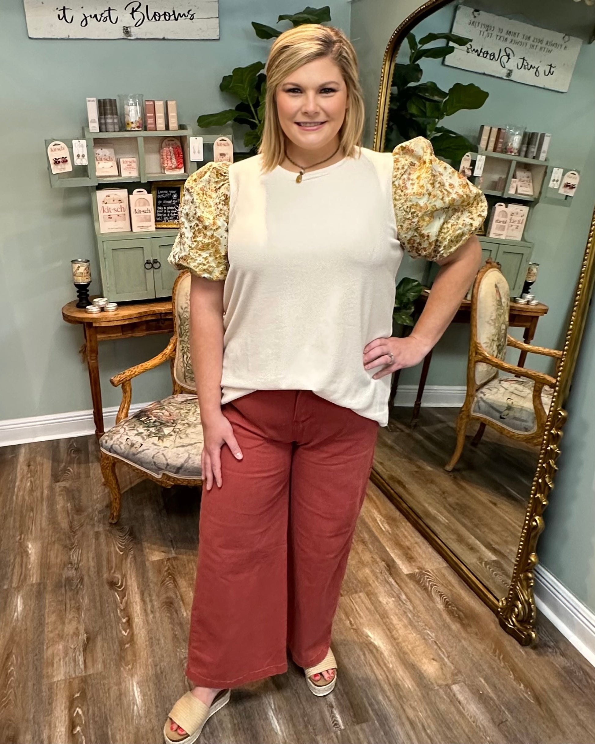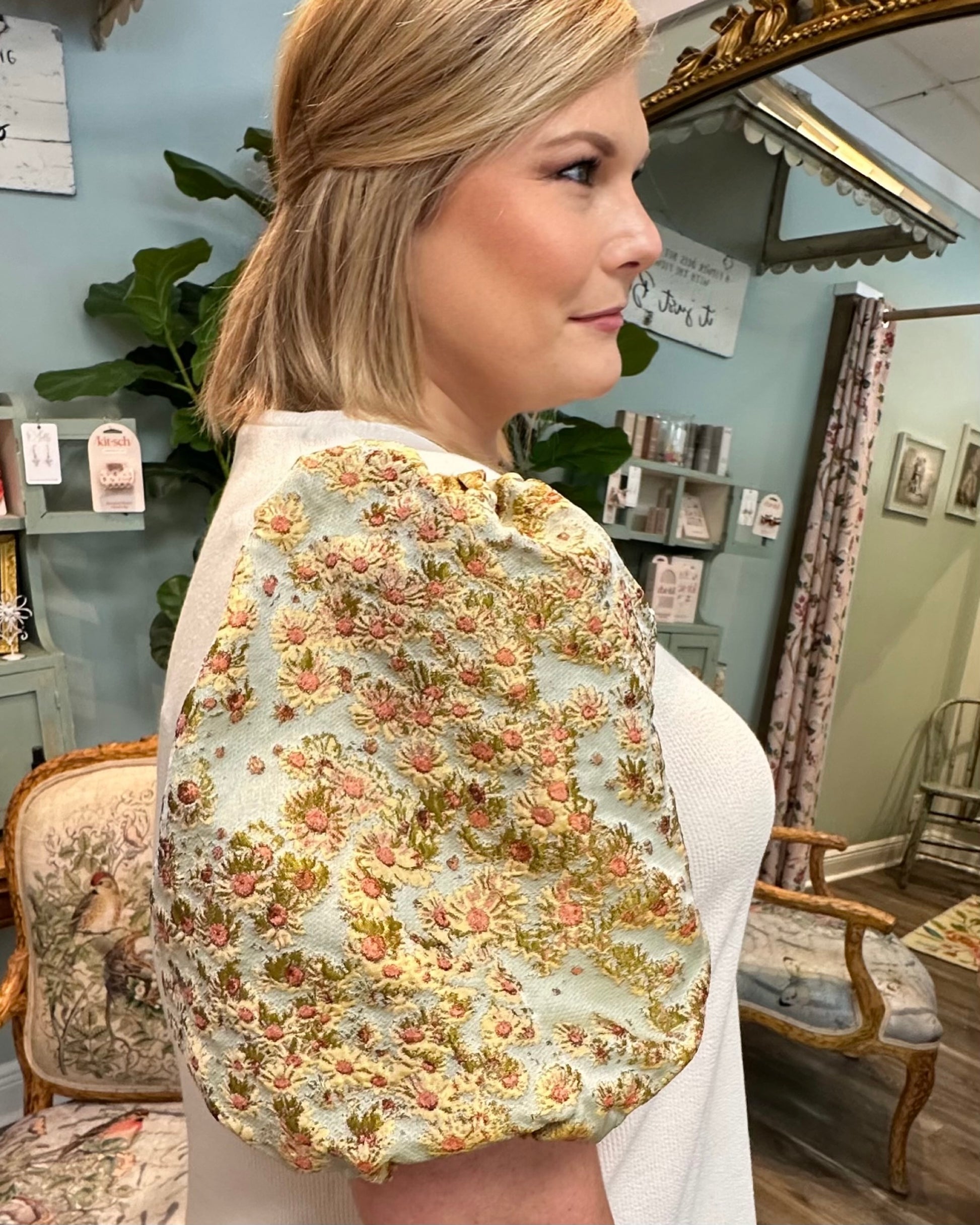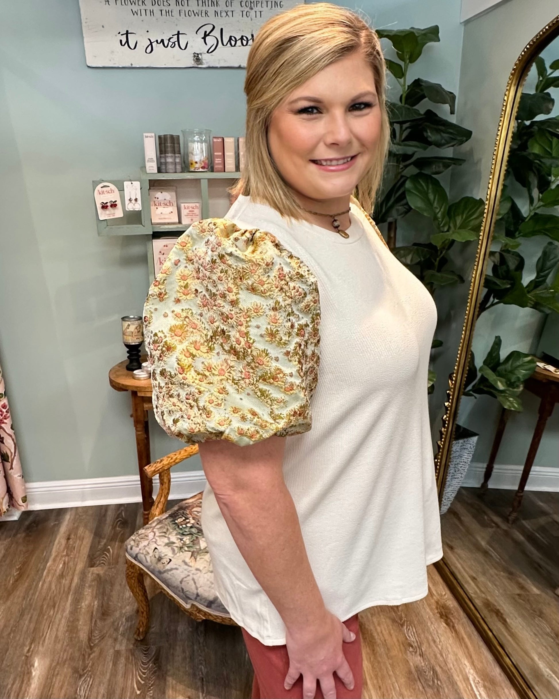 Elevate your wardrobe with this textured top featuring charming floral puff sleeves. Its unique texture adds depth, while the puffed floral sleeves bring a playful, feminine touch. Perfect for both casual days and special occasions, this top combines comfort with standout style effortlessly. Make a statement wherever you go with this elegant yet easy-to-wear piece.