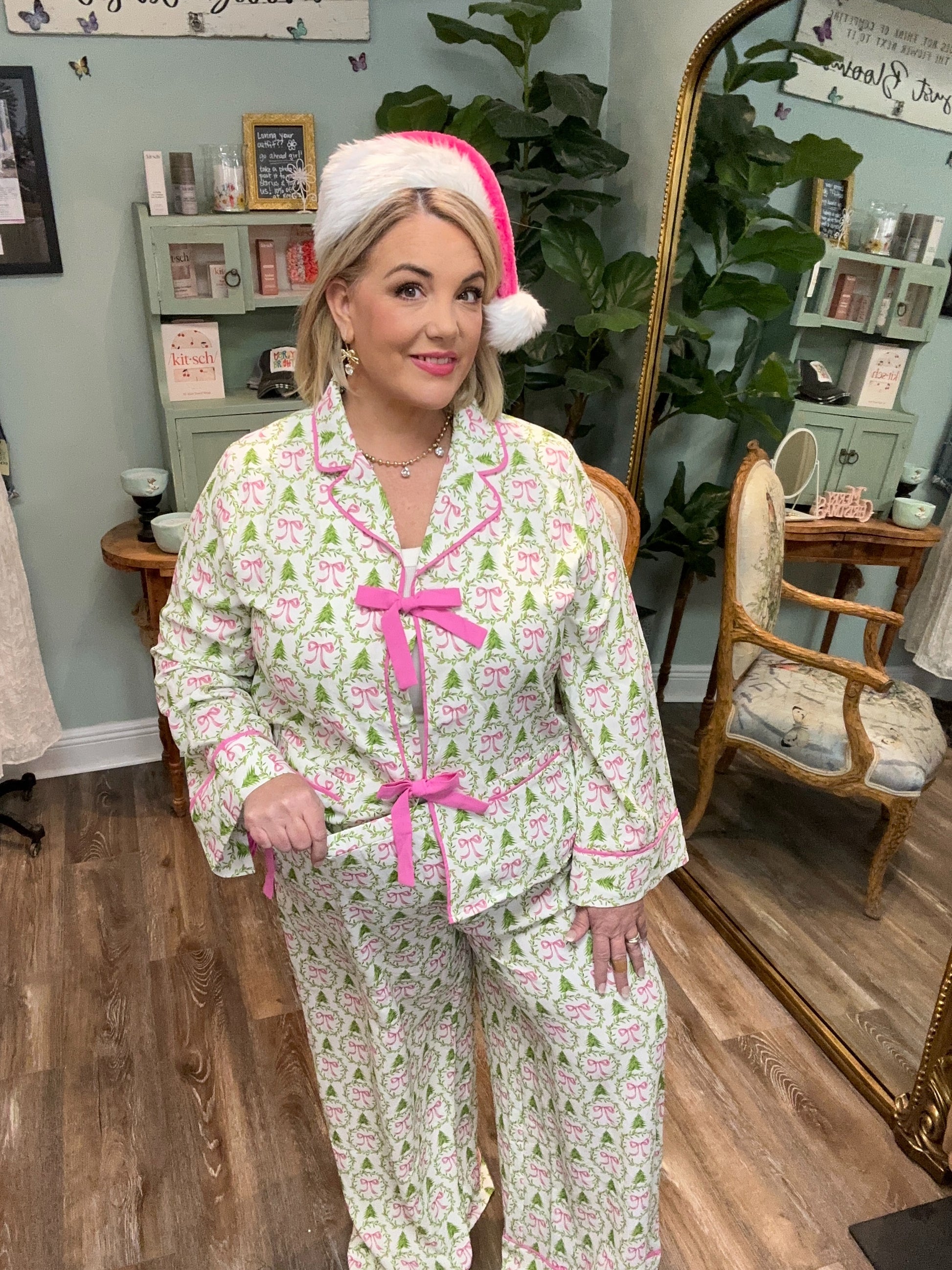 "Spread holiday cheer (and major comfort) with this Two Piece Bow and Tree Pajama Set. Made with Christmas pajamas in mind, this set features a festive bow and tree design. Perfect for cuddling up by the fire or opening presents Christmas morning. Order now and sleigh the holiday season!"